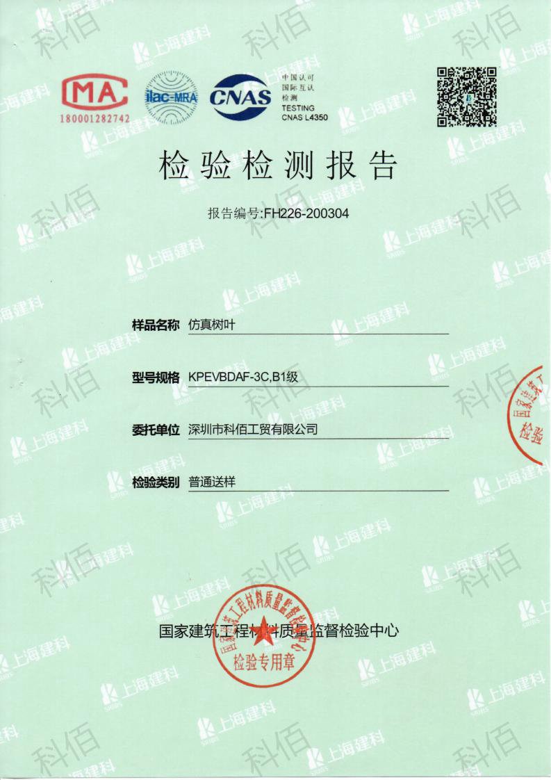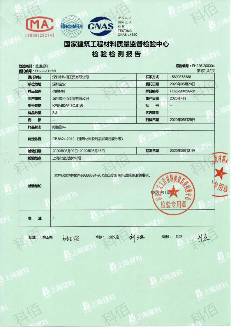 2020年6月份科佰再一次成功通過國家建筑工程材料質(zhì)量監(jiān)督檢測對仿真樹葉產(chǎn)品進(jìn)行防火燃燒性能檢測,檢測科佰仿真樹葉產(chǎn)品的質(zhì)量過硬,達(dá)到了B1級的防火阻燃要求。此次仿真樹葉檢測燃燒性能是指材料燃燒或遇火時所發(fā)生的一切物理和化學(xué)變化,不同材料的防火性能決定了改材料的防火等級,科佰研發(fā)實(shí)驗(yàn)室開展對各類防火產(chǎn)品的抽查檢驗(yàn),委托第三方檢測對科佰產(chǎn)品進(jìn)行防火燃燒性能檢測,對各類送檢材料進(jìn)行嚴(yán)格的防火性能測試、防火等級檢測,可出具權(quán)威資質(zhì)認(rèn)證、國家認(rèn)可的檢測報(bào)告和分析報(bào)告。