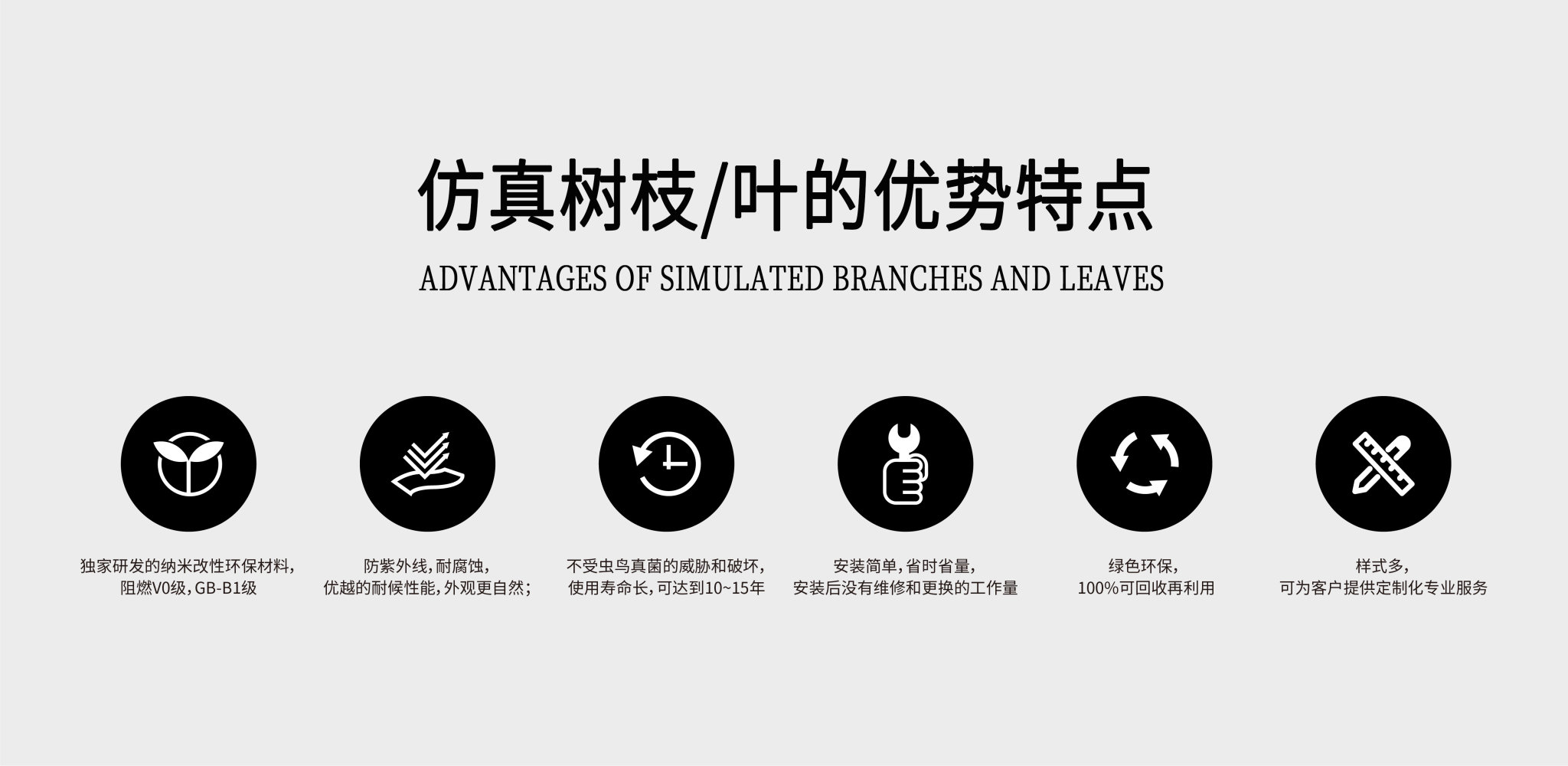 ? ? ? ? 仿真樹枝葉是深圳市科佰工貿(mào)有限公司采用目前國際上先進(jìn)的納米合成高分子材料技術(shù)和工藝生產(chǎn)。利用納米粒子的特有的物理化學(xué)性質(zhì),使得其具有更加優(yōu)異的耐候性及阻燃性,能滿足美國ASTM-G154-06 抗UV老化測試標(biāo)準(zhǔn),并能通過美標(biāo)UL94-V0級阻燃,在國內(nèi)仿真樹枝葉也通過了國家防火建材阻燃測試B1級。?